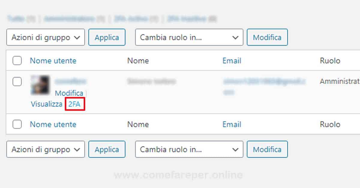Dalla colonna di sinistra, nella bacheca principale di WordPress, individua la sezione “Utenti” e cliccaci su. In “Tutti gli utenti“, individua il tuo account amministratore, passa il cursore del mouse sulla foto a sinistra e fai comparire la dicitura “2FA“. Clicca su 2FA. (Non chiudere la pagina).
