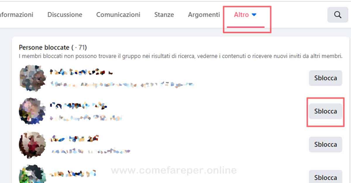 Come ti ho già detto prima, la procedura è cambiata perché è cambiato tutto il posizionamento delle varie impostazioni. Segui questo articolo e scoprirai come sbloccare un contatto che hai bloccato con la vecchia versione di Facebook. Ricorda che: “I membri bloccati non possono trovare il gruppo nei risultati di ricerca, vederne i contenuti o ricevere nuovi inviti da altri membri”.